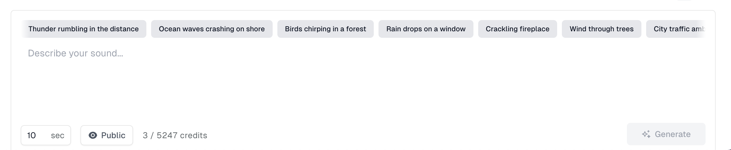 Create any sound you can imagine - from realistic environmental sounds to abstract audio effects. Our AI handles everything from simple sound effects to complex soundscapes with ease.